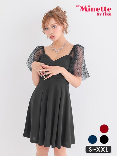3. [SALE] [新作] ミニドレス プチプラ 新人 ワンピース オフショル フレア シアー シアー袖 ドット柄 低身長 谷間 ハートカット 黒 キャバドレス (きぃぃりぷ着用/S~XXLサイズ対応) | myMinette/マイミネット