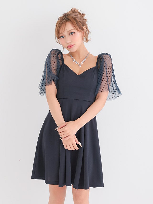 5. [新作] ミニドレス プチプラ 新人 ワンピース オフショル フレア シアー シアー袖 ドット柄 低身長 谷間 ハートカット プリーツ ネイビー キャバドレス (きぃぃりぷ着用/S~XXLサイズ対応) | myMinette/マイミネット