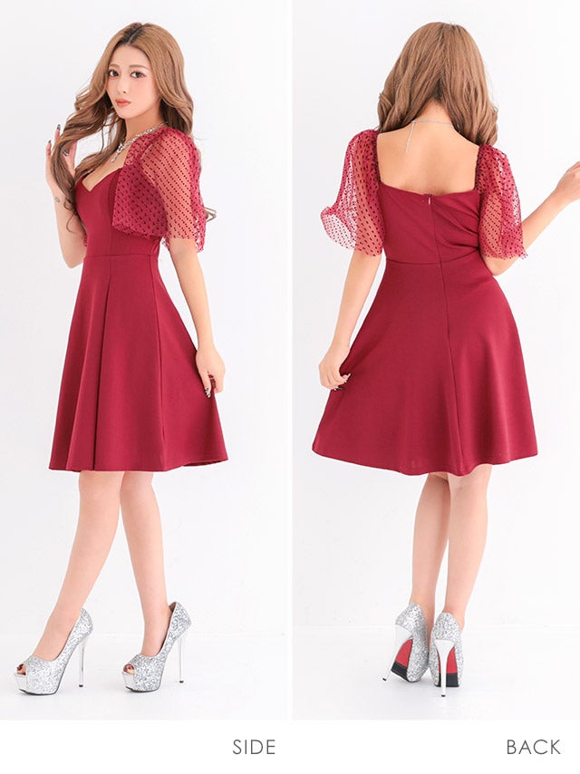 ミニドレス プチプラ 新人 ワンピース オフショル フレア シアー シアー袖 ドット柄 低身長 谷間 ハートカット プリーツ ネイビー キャバドレスサイドバック