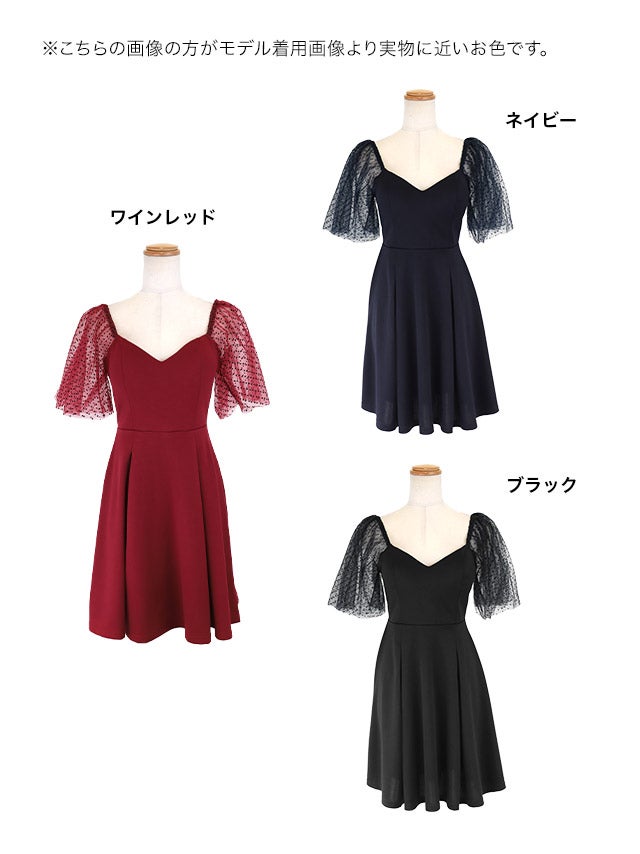 ミニドレス プチプラ 新人 ワンピース オフショル フレア シアー シアー袖 ドット柄 低身長 谷間 ハートカット プリーツ ネイビー キャバドレス商品画像3