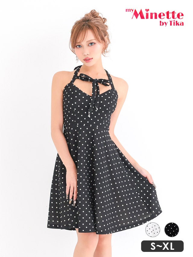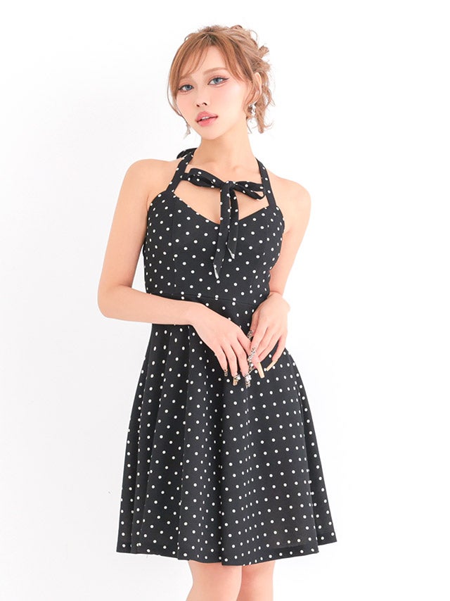 [新作] ミニドレス プチプラ 新人 ワンピース フレア ホルターネック ラウンジ ドット柄 低身長 谷間 リボン ガーリー 黒 キャバドレス (あん着用/S~XLサイズ対応) | myMinette/マイミネット