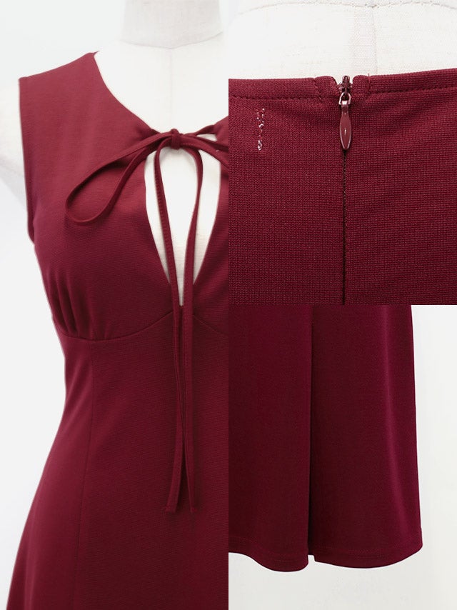 ミニドレス プチプラ ギャル フレア セクシー ラウンジ ノースリーブ 低身長 谷間 プリーツ ワンカラー ワインレッドサイドバック