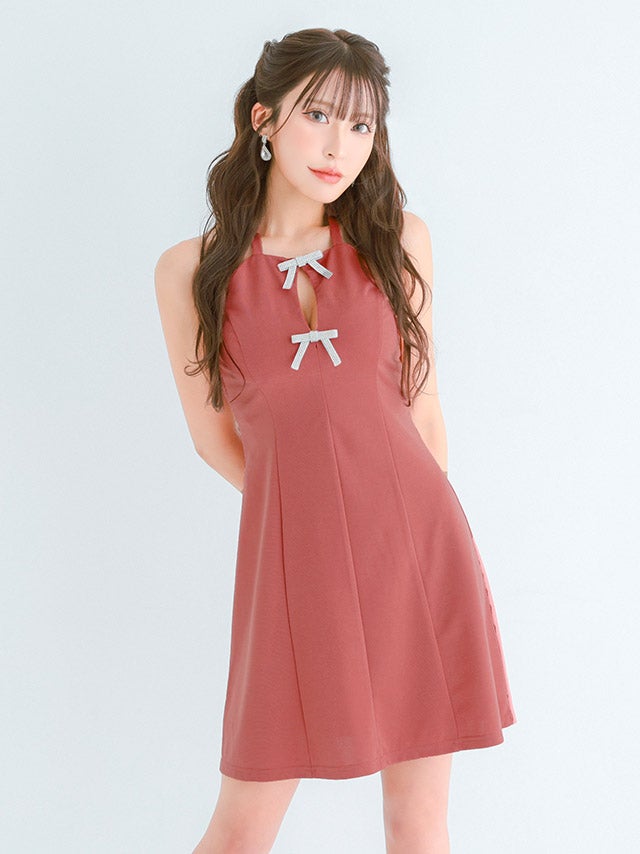 ミニドレス プチプラ 新人 フレア ホルターネック セクシー ラウンジ キラキラ 低身長 谷間 リボン ローズピンク キャバドレスサイドバック