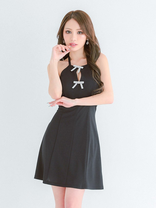 ミニドレス プチプラ 新人 フレア ホルターネック セクシー ラウンジ キラキラ 低身長 谷間 リボン シンプル 黒 ブラック キャバドレス
