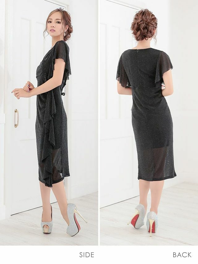 4. フリル袖ワンカラーVネックプチプラ半袖膝丈ドレス (Mサイズ/Lサイズ)(中尾みほ/キャバドレス着用)[myMinette/マイミネット]