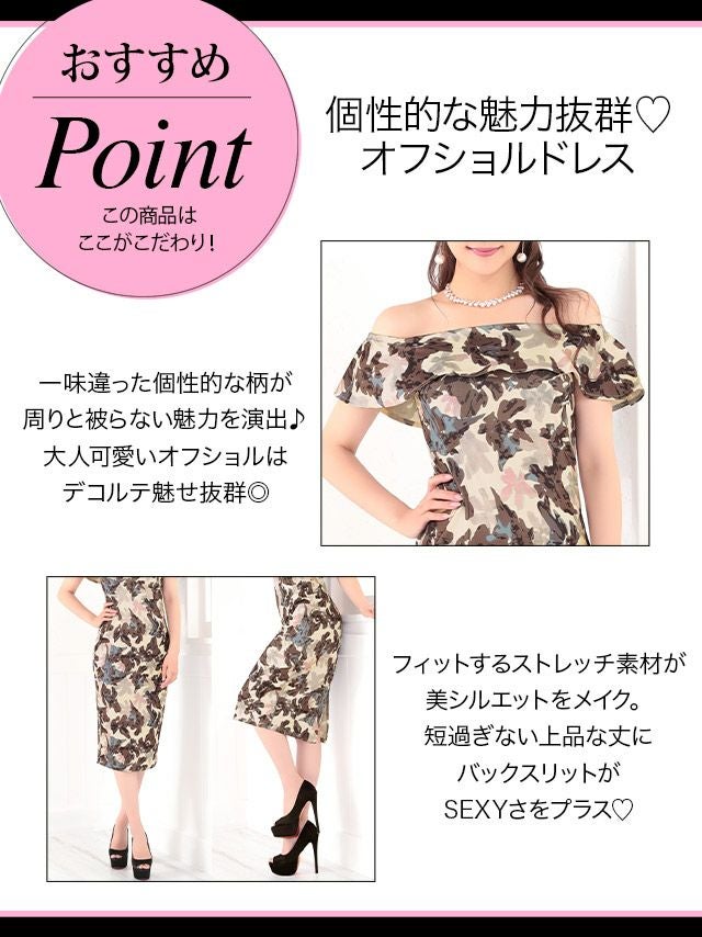 キャバドレス 激安 myMinetteマイミネット フリルオフショルカモフラージュ柄ミディアムドレス キャバ ドレス 大きいサイズ タイトドレス ナイトドレス キャバ嬢 キャバクラ ラウンジ スナック 安い 通販