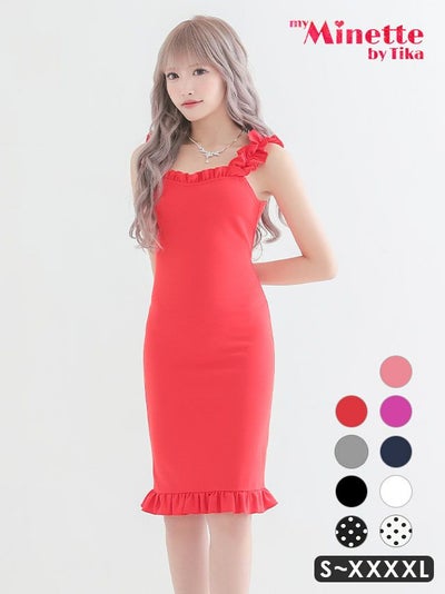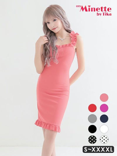 [SALE]膝丈ドレス プチプラ 新人 タイト ワンピース ノースリーブ 低身長 胸元隠し 背中魅せ スクエアネック ワンカラー 肩フリル 清楚 白 キャバドレス (ひなたまる着用/S〜XXXXLサイズ対応) | myMinette/マイミネット