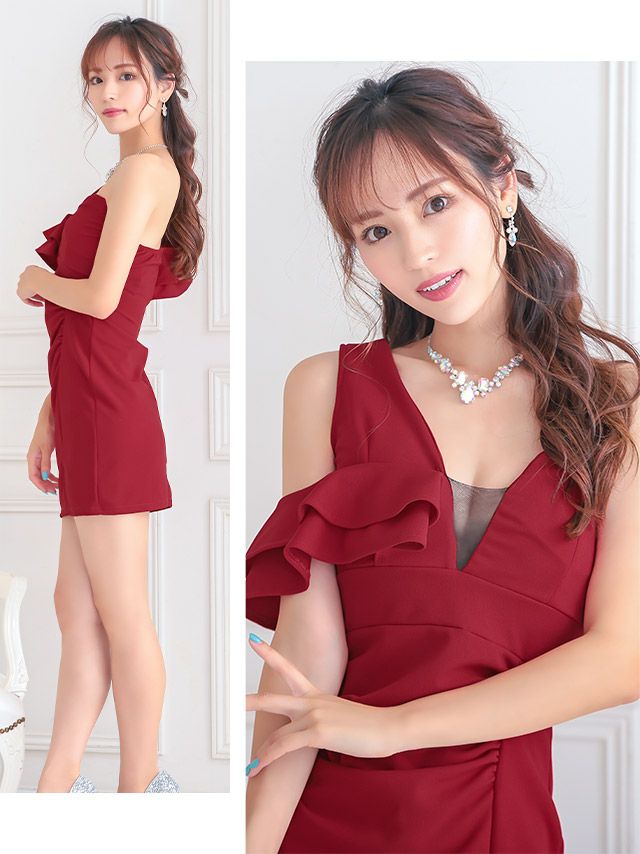 キャバドレス 安い 激安 ミニ丈 キャバクラ クラブ ラウンジ ワンショルダー フリル 袖 シアー素材 タイト スリット ミニドレス プチプラドレス
