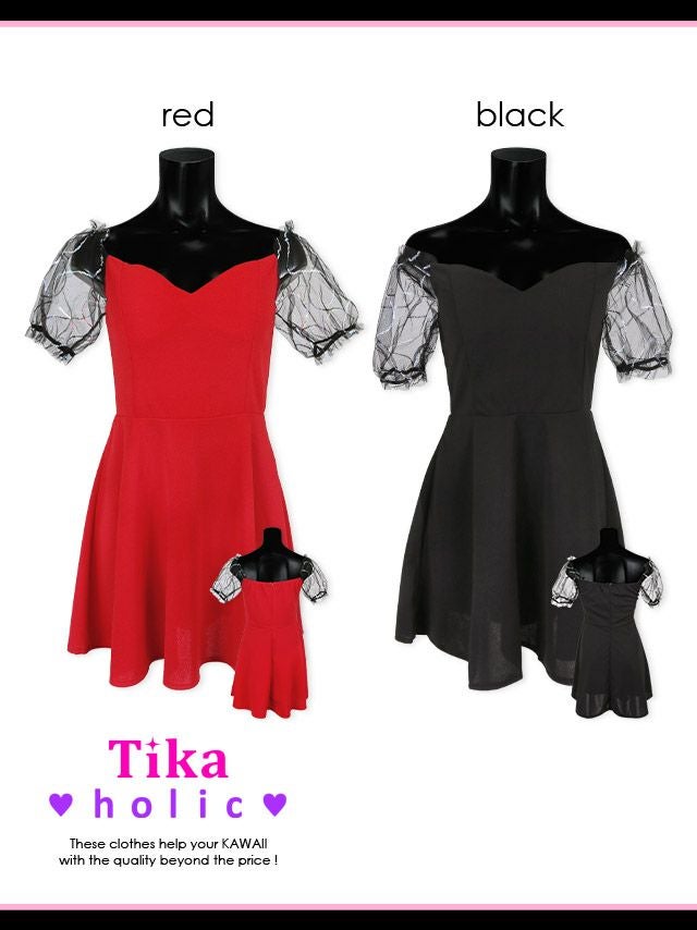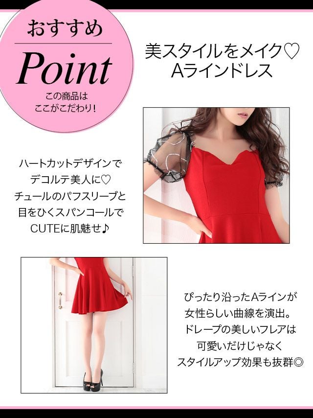 5. シースルーチュールパフスリーブプチプラ半袖フレアミニドレス(Sサイズ) (本谷紗己/キャバドレス着用) [myMinette/マイミネット]