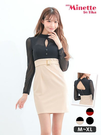 [SALE] シアー長袖ウエストベルトバックオープンタイトミニドレス(Mサイズ~XLサイズ)(今井アンジェリカ/キャバドレス着用)[myMinette/マイミネット]