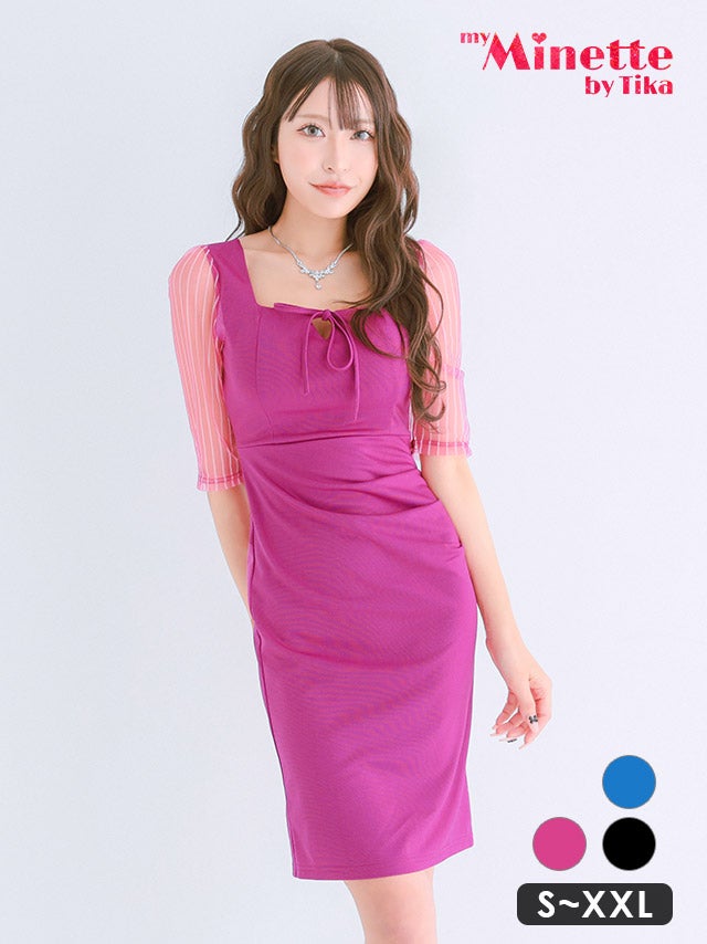5. [新作] 膝丈ドレス プチプラ 新人 タイト 袖あり ワンピース ラウンジ 半袖 シアー シアー袖 低身長 リボン ストライプ 黒 キャバドレス (みのり着用/S~XXLサイズ対応) | myMinette/マイミネット