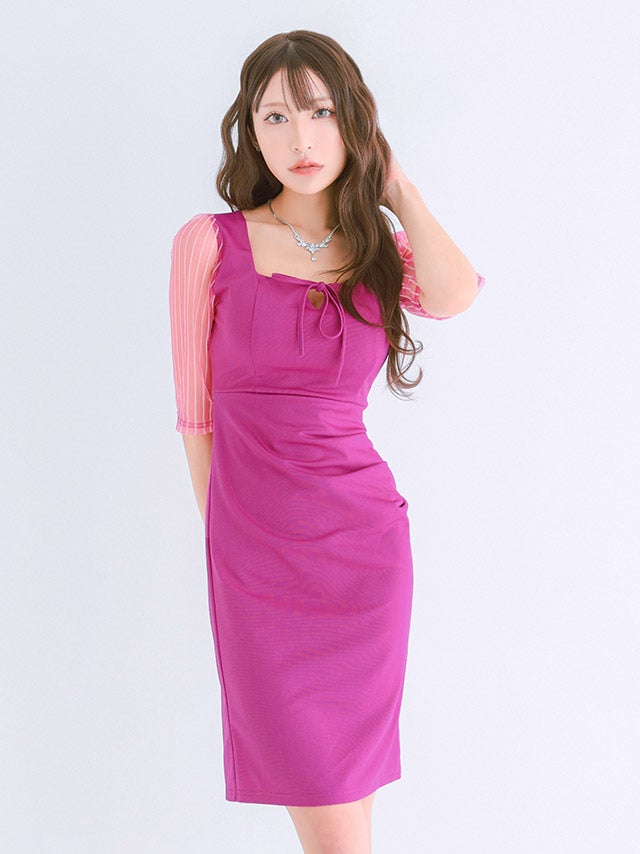膝丈ドレス プチプラ 新人 タイト 袖あり ワンピース ラウンジ 半袖 シアー シアー袖 低身長 リボン ストライプ 黒 キャバドレスカラー