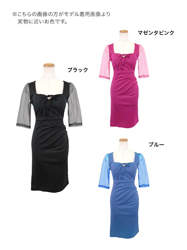 膝丈ドレス プチプラ 新人 タイト 袖あり ワンピース ラウンジ 半袖 シアー シアー袖 低身長 リボン ストライプ 黒 キャバドレス商品画像3