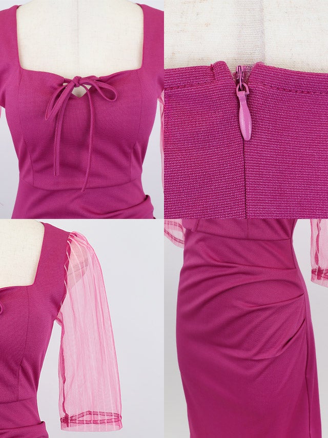 膝丈ドレス プチプラ 新人 タイト 袖あり ワンピース ラウンジ 半袖 シアー シアー袖 低身長 リボン ストライプ 黒 キャバドレスサイドバック