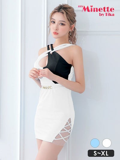[SALE]クロス ホルターネック バイカラー サイドカット プチプラ タイト ミニドレス (Sサイズ~XLサイズ) (せいせい/キャバドレス着用)[myMinette/マイミネット]