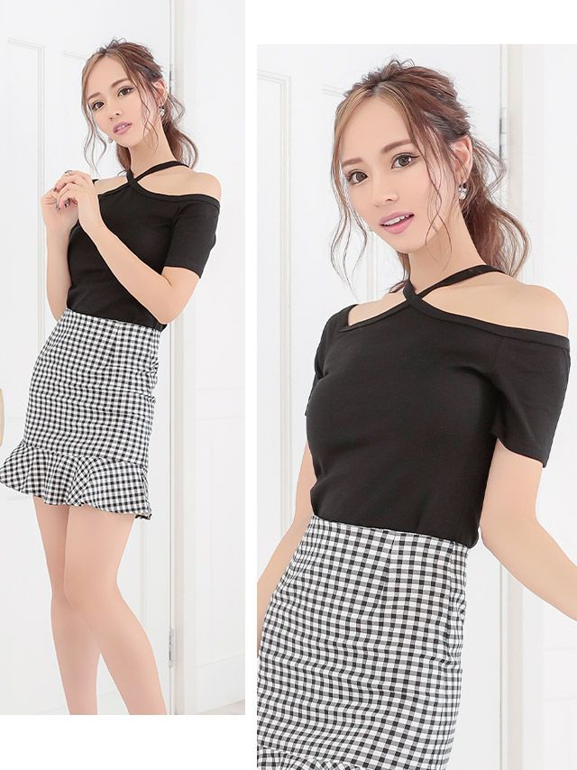 キャバドレス 激安 myMinetteマイミネット 肩出しトップスウエスト切り替えモノトーンチェック柄ミニドレス