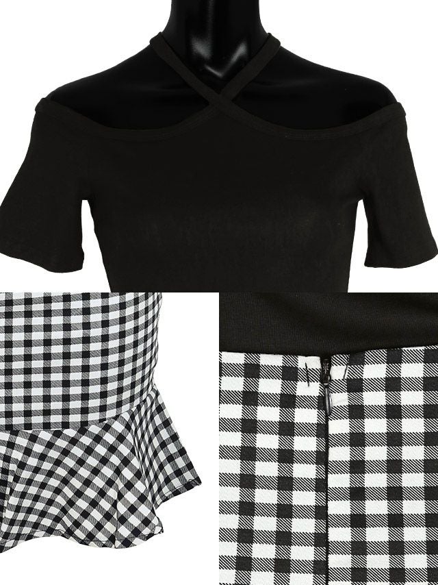 肩出しトップスウエスト切り替えモノトーンチェック柄ミニドレス
