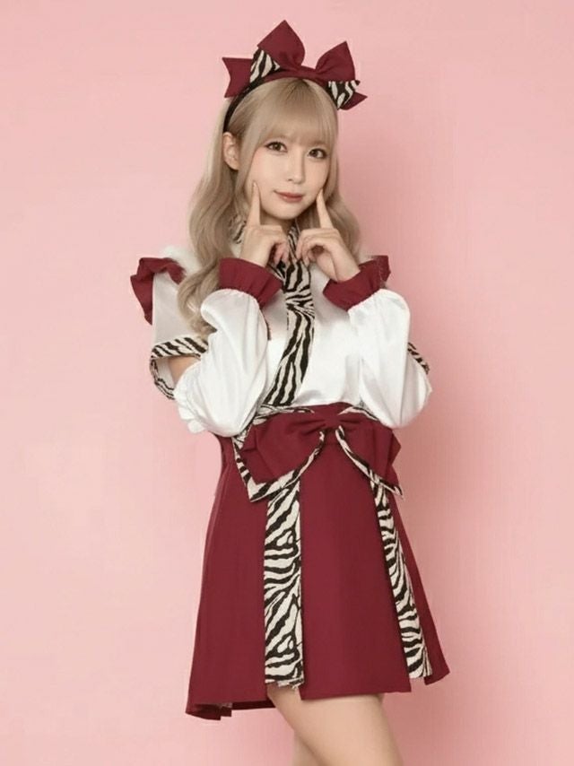 [新作] 巫女 コスプレ 鬼 節分 お化けの日 タッセル付き フレアスカート 体型カバー ガーリー リボン フリル 3点セット (ワンピース/カチューシャ/アームカバー)