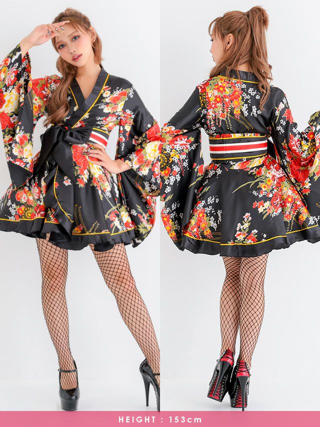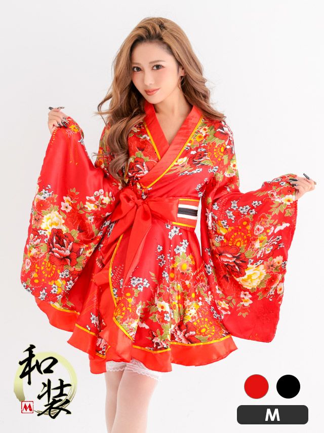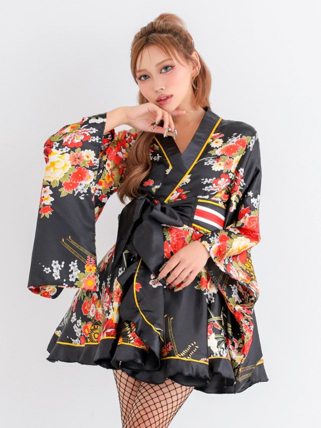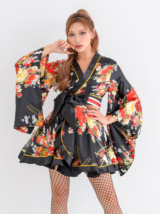 [新作]コスプレ セクシー 花魁 ミニ リボン フレア 2点セット(着物ドレス/帯)