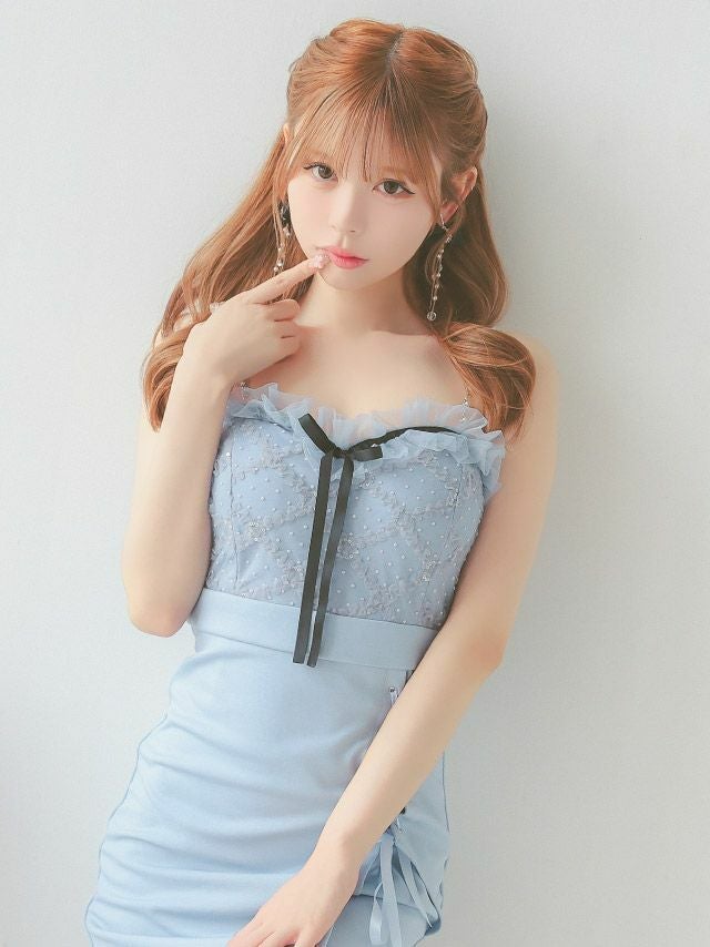 5. [新作] ミニドレス ビジューキャミソール リボン ドット柄 チュールフリル サイド編み上げ ラップ タイト キャバドレス (黒嵜菜々子着用) [tk-md254107a][Tika/ティカ]