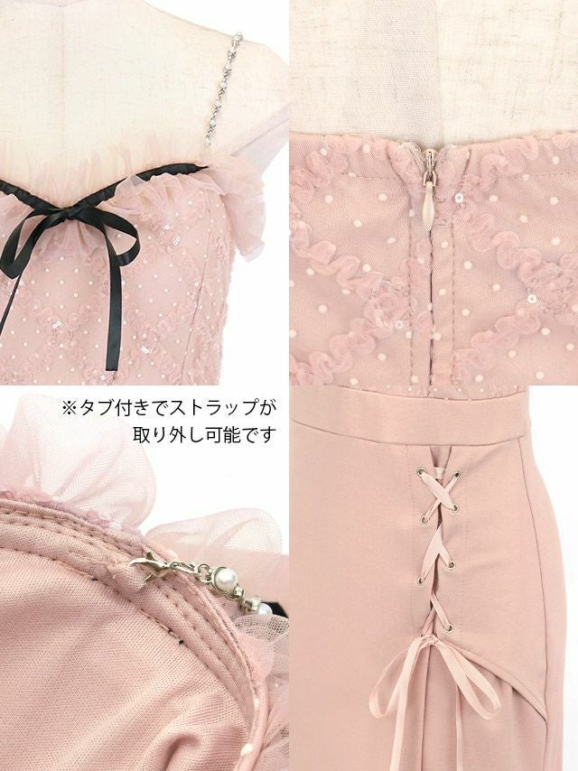 ミニドレス ビジューキャミソール リボン ドット柄 チュールフリル サイド編み上げ ラップ タイト キャバドレス のディティール画像2枚目