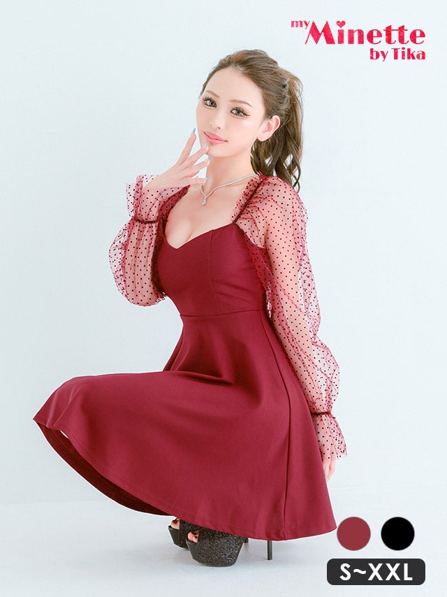 5. [新作] ミニドレス プチプラ 新人 長袖 袖あり ワンピース フレア シアー袖 ドット柄 低身長 黒 キャバドレス (ちぴたん着用/S~XXLサイズ着用) | myMinette/マイミネット