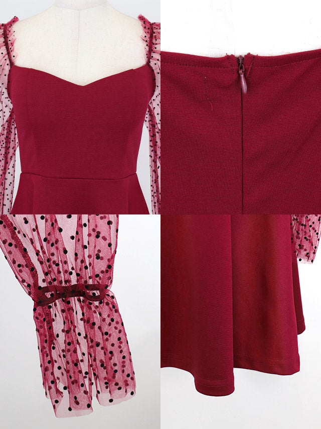 ミニドレス プチプラ 新人 長袖 袖あり ワンピース フレア シアー袖 ドット柄 低身長 ガーリー ワインレッド キャバドレスディティール1