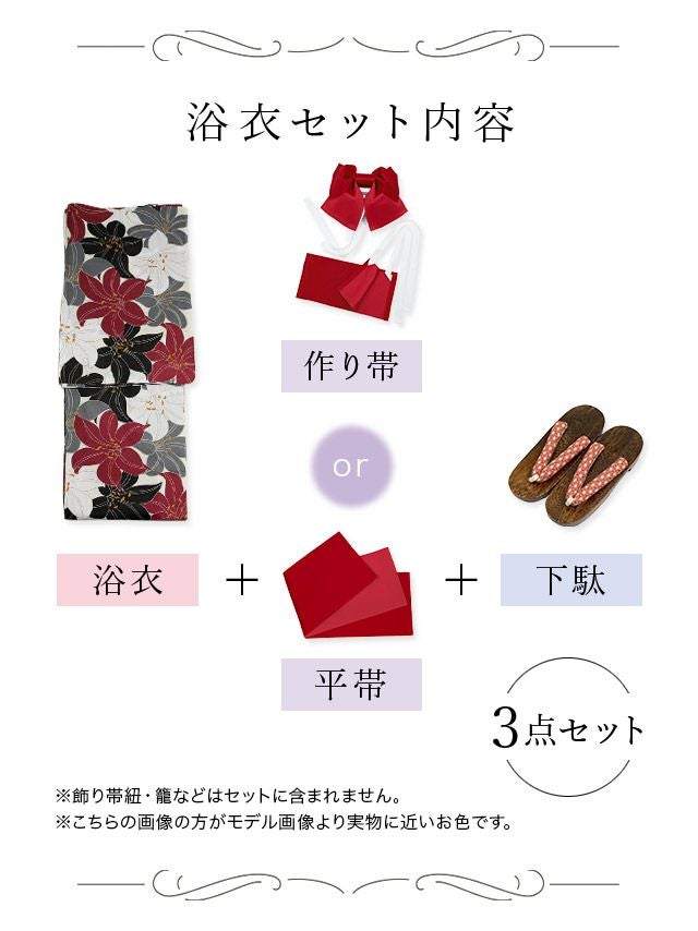 3. [新作] 浴衣 選べる帯 アンティーク4色百合模様 浴衣3点セット (浴衣+平帯or作り帯+下駄)