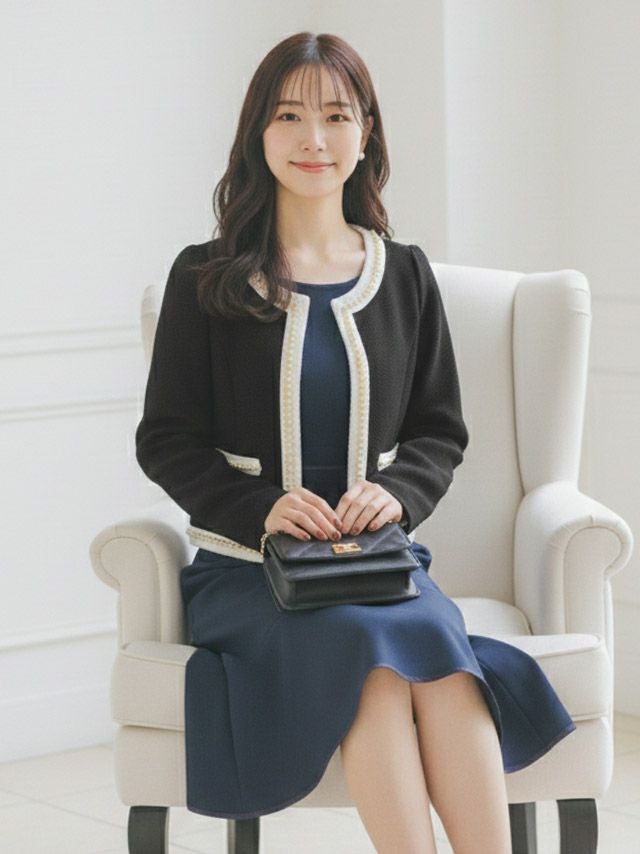 ボレロでありながら、まるで上品なジャケットを羽織ったかのようなフォーマルな印象を与えます。