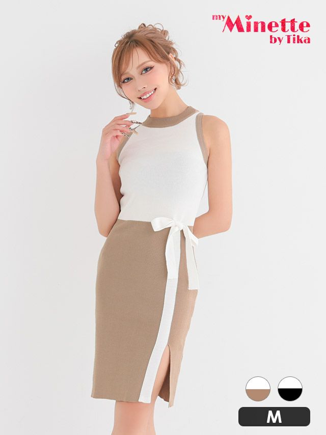 3. [新作] 膝丈ドレス リブニット バイカラー リボン ノースリーブ キャバドレス (きぃぃりぷ着用)[th-mdtc2059a]