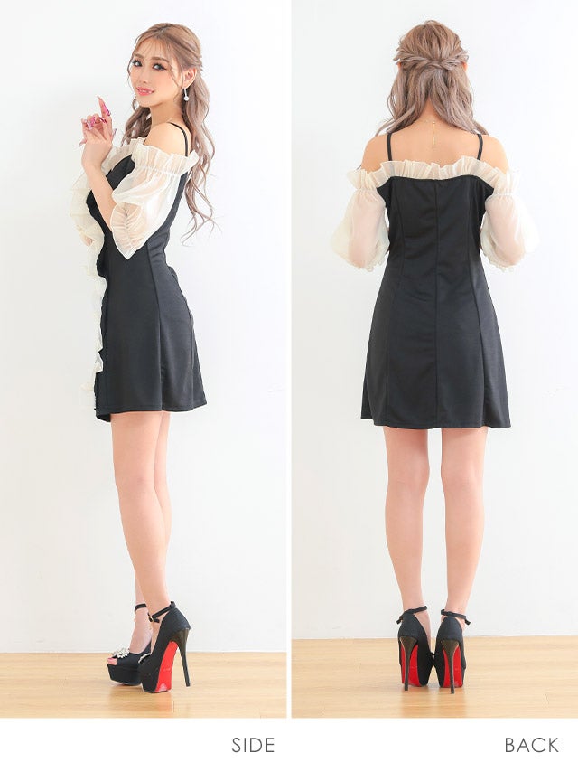 ミニドレス プチプラ 新人 タイト 袖あり ワンピース オフショル シアー シアー袖 低身長 胸元隠し 同伴 フロントダブルボタン 黒 キャバドレス商品画像2
