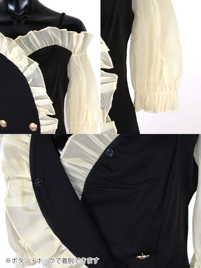 ミニドレス プチプラ 新人 タイト 袖あり ワンピース オフショル シアー シアー袖 低身長 胸元隠し 同伴 フロントダブルボタン 黒 キャバドレス商品画像3