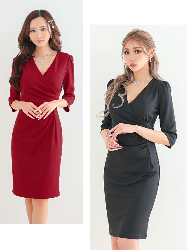 4. [SALE] 膝丈ドレス プチプラ 新人 タイト 袖あり ネイビー ワンカラー シンプル Vネック 7分袖 カシュクール キャバドレス (れいたぴ着用/S〜XXXLサイズ対応) | myMinette/マイミネット