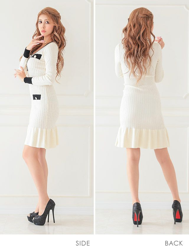 キャバドレス 安い 激安 ミニ丈 キャバクラ クラブ ラウンジ 長袖 ニット 裾フリル タイト ゴールドボタン プチプラ 膝丈ドレス プチプラドレス