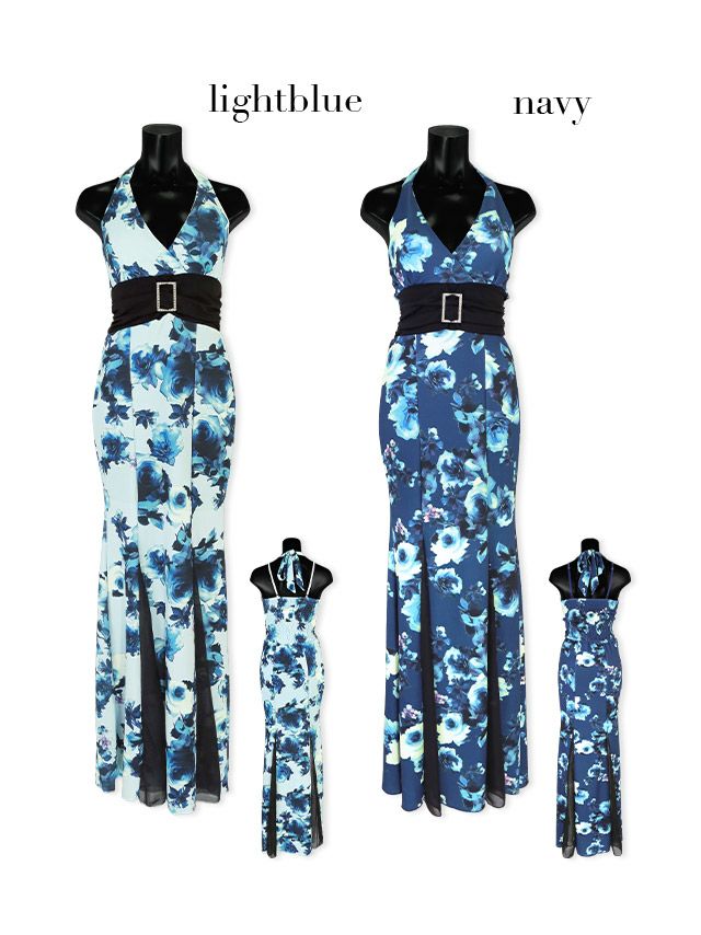 ホルターネックフラワーウエストベルトシアー切替タイトロングドレスのカラー