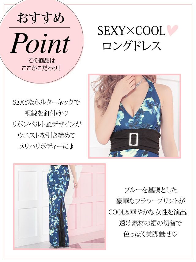キャバドレス 安い 激安 ミニ丈 キャバクラ クラブ ラウンジ ホルターネック フラワー ウエストベルト シアー切替 タイト ロング ドレス プチプラドレス