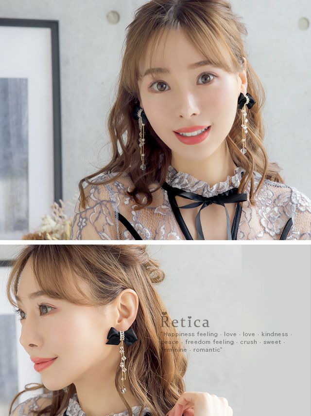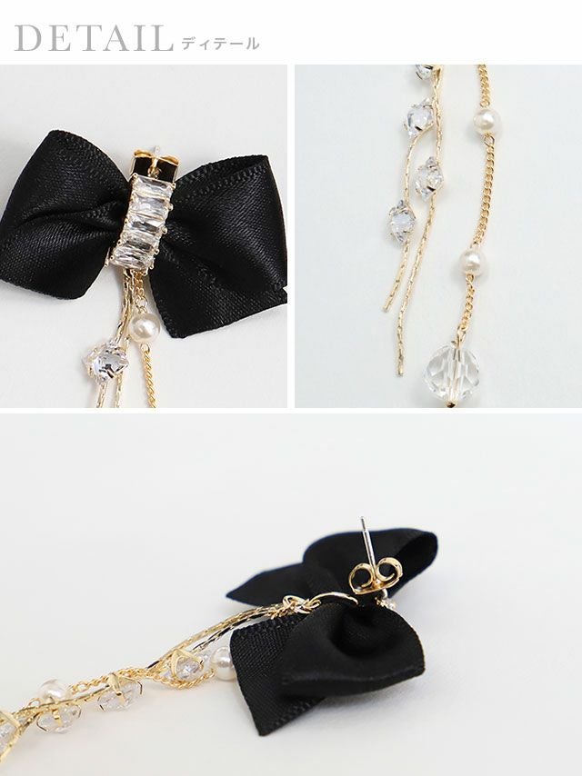 ストーンビジュー付きゴールドチェーンサテンリボンピアス