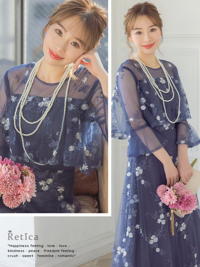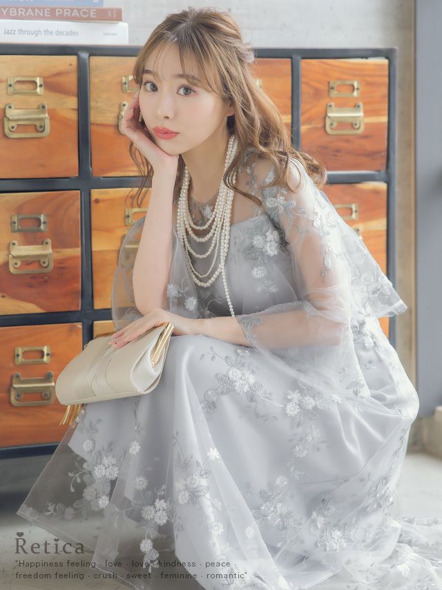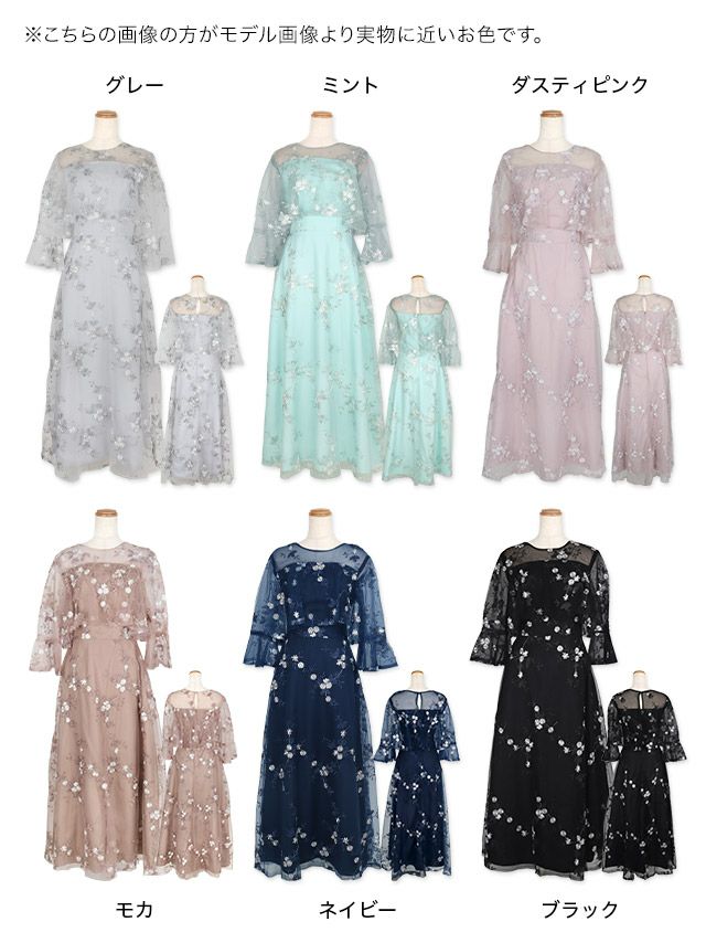 シアー フラワー刺繍 チュール ロングスカート ベルスリーブ 結婚式 パーティー ドレス myMinette マイミネット フラワー刺繍ウエスト切替シースルーロング結婚式パーティードレス