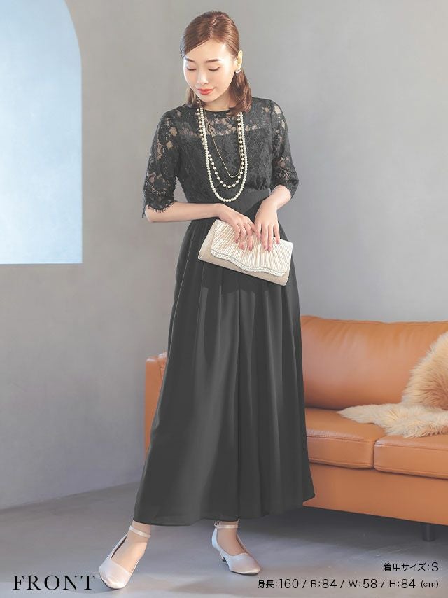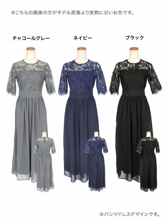 パーティードレス お呼ばれ 結婚式 ロング丈 袖あり 体型カバー myMinette マイミネット レース トップ ハイウエスト 切り替え 大人 結婚式 パーティー ワイド パンツドレス