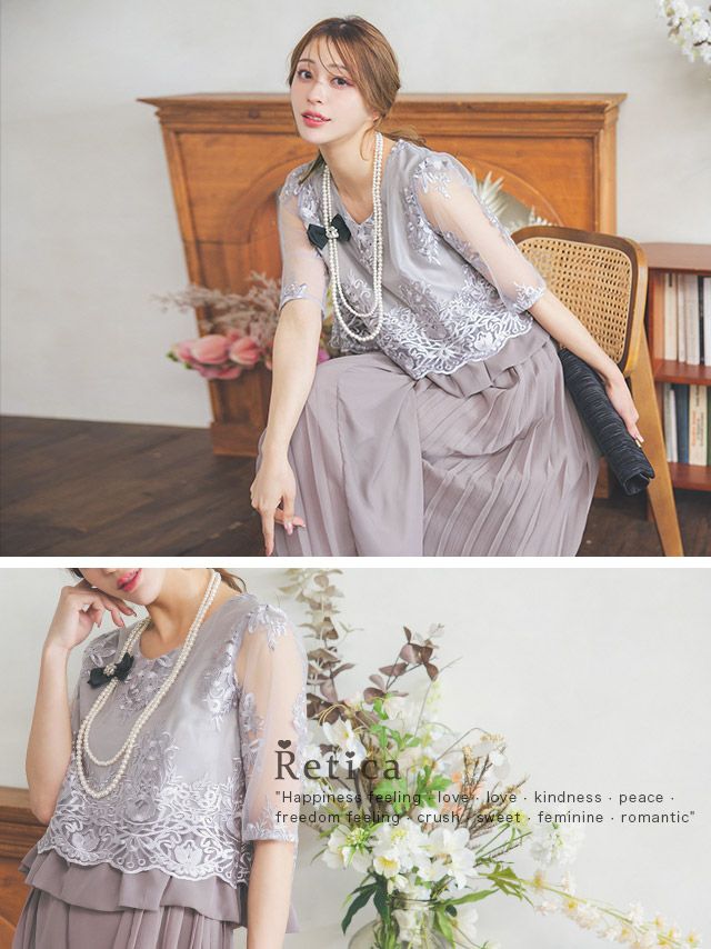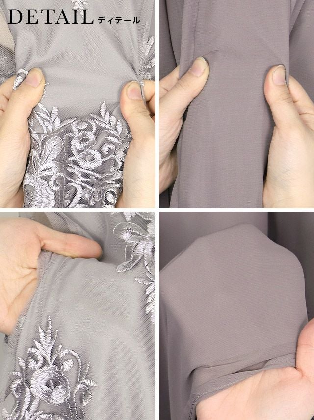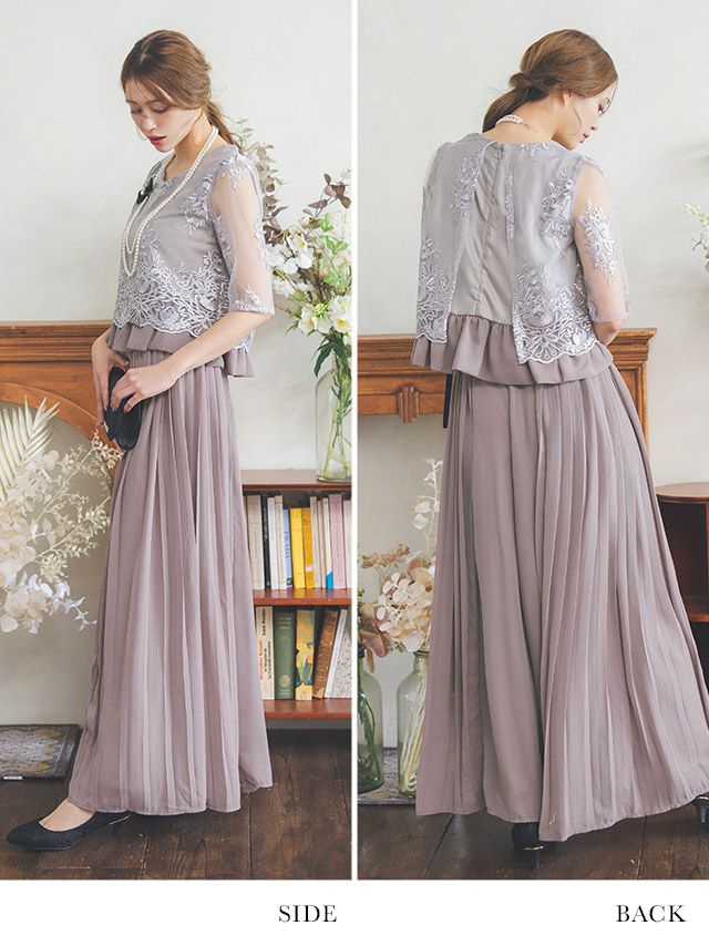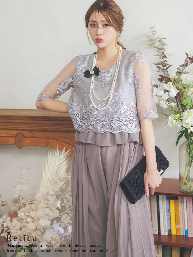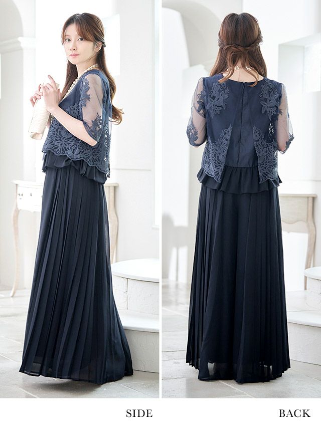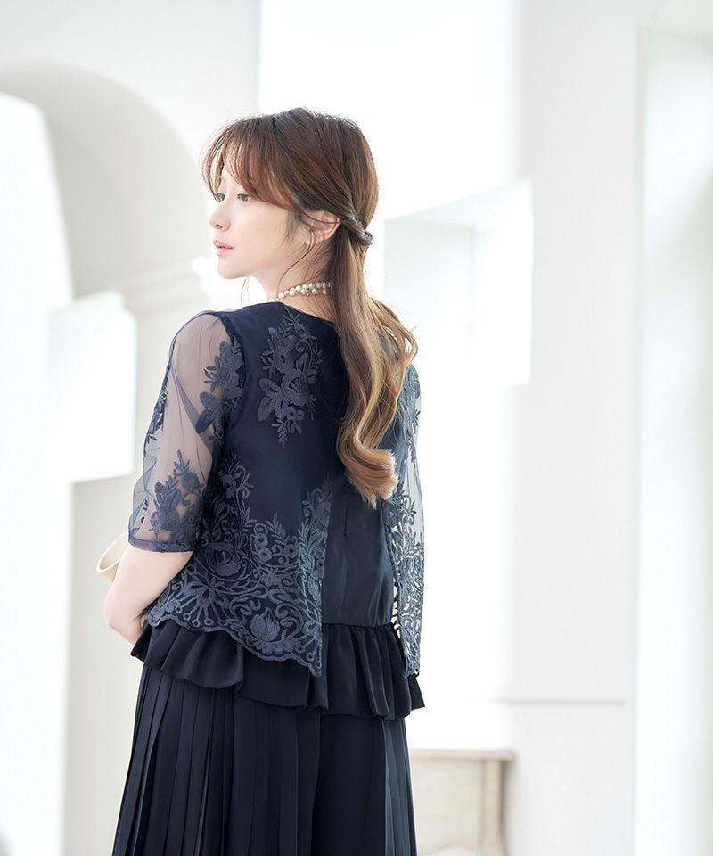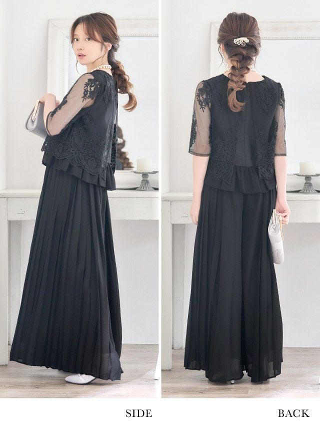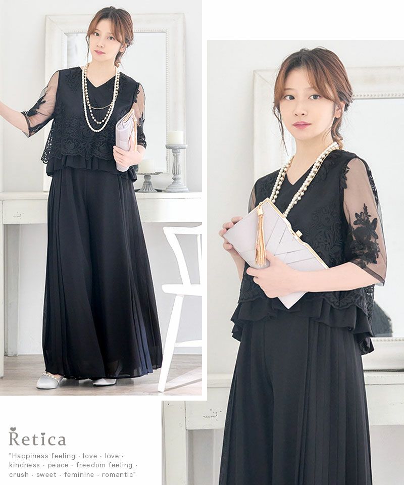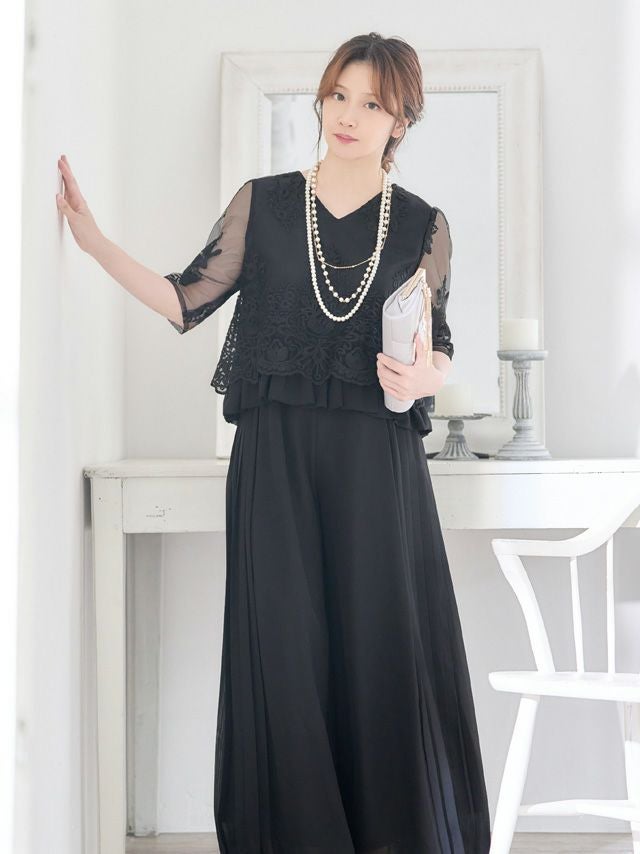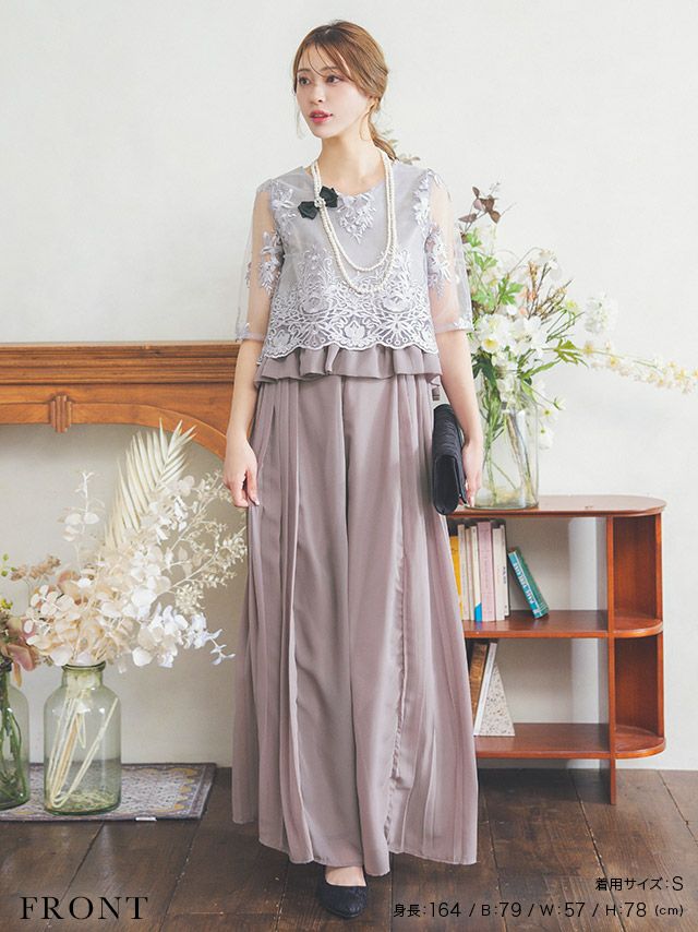 パーティードレス お呼ばれ 結婚式 ロング丈 袖あり 体型カバー myMinette マイミネット フラワー 刺繍 レース 半袖 ペプラム デザイン 大人 ワイド ハンサム パンツドレス