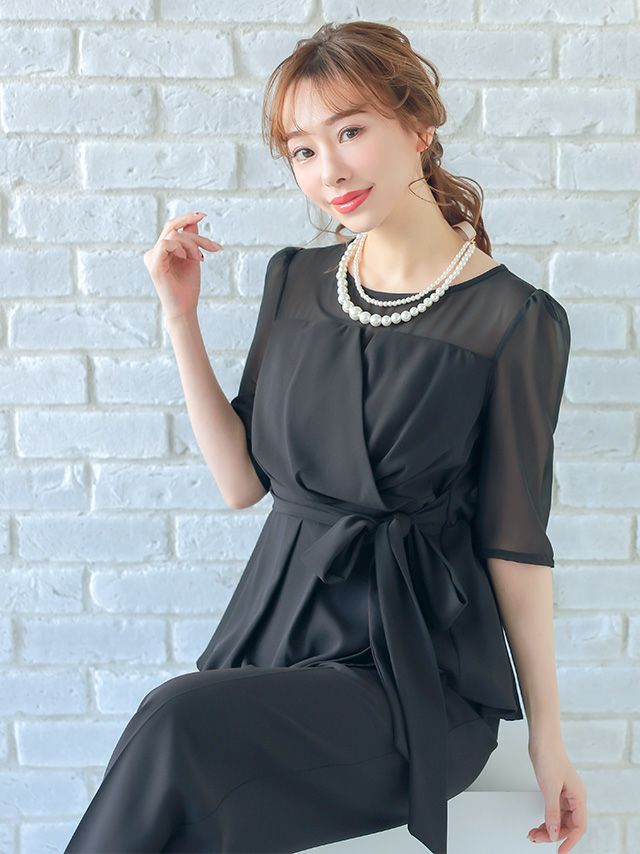結婚式 お呼ばれ パーティー myMinette マイミネット バックリボンシアーショルダースリーブパンツ結婚式パーティードレス