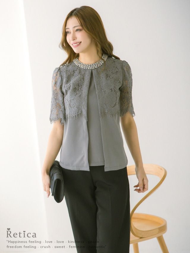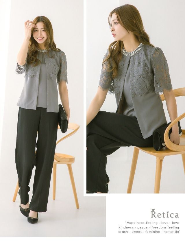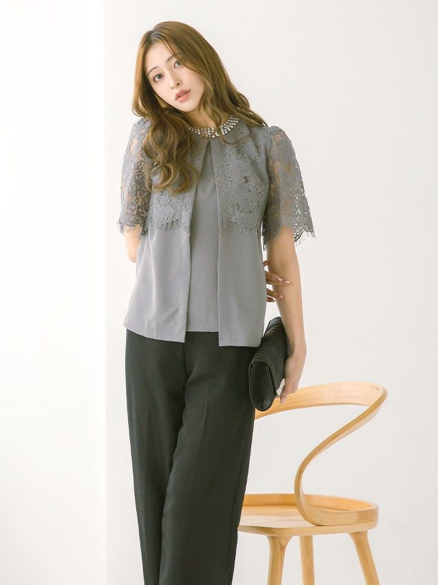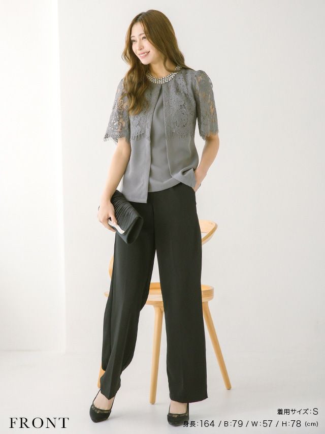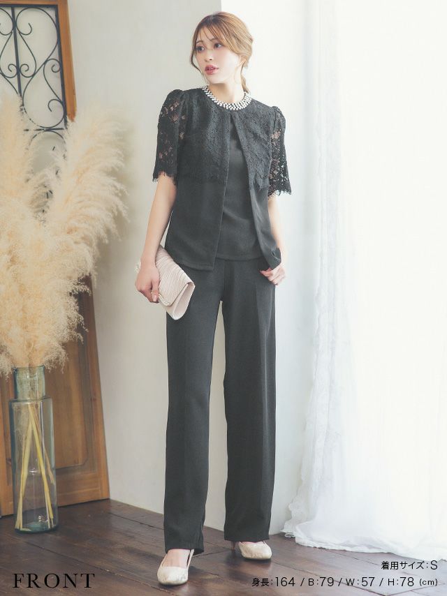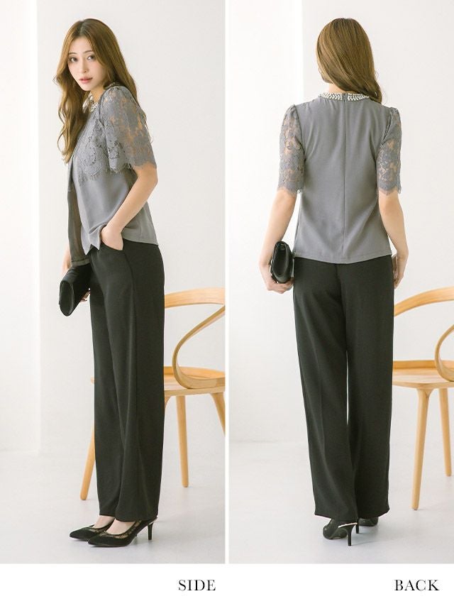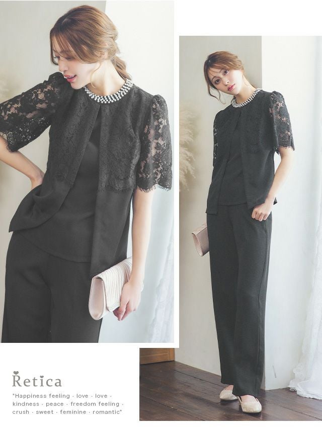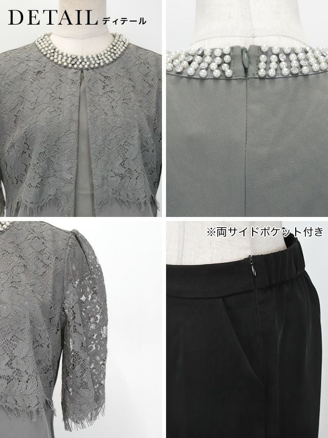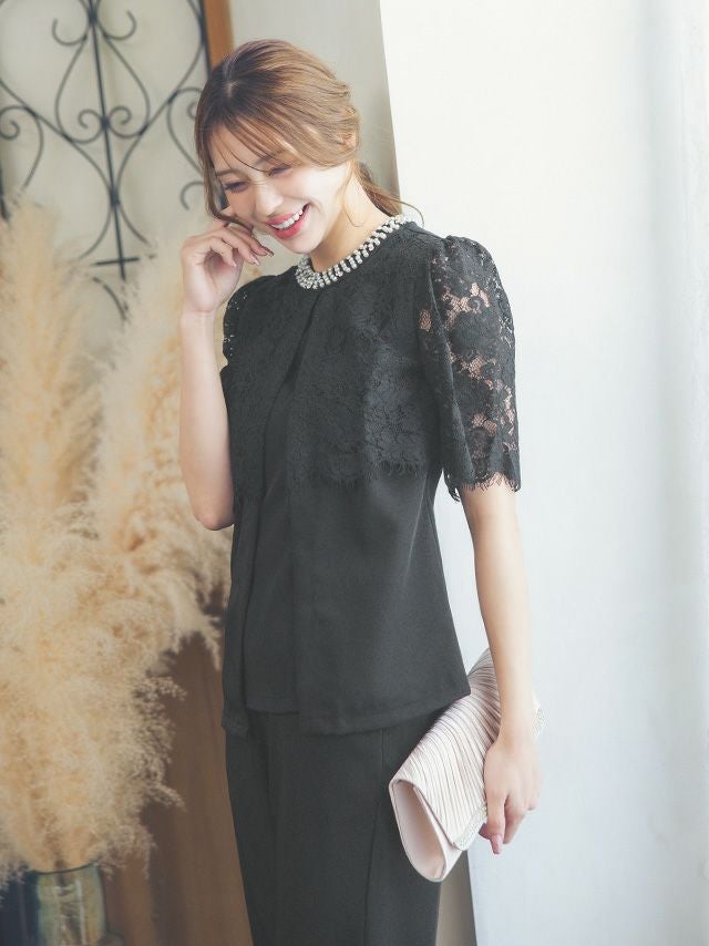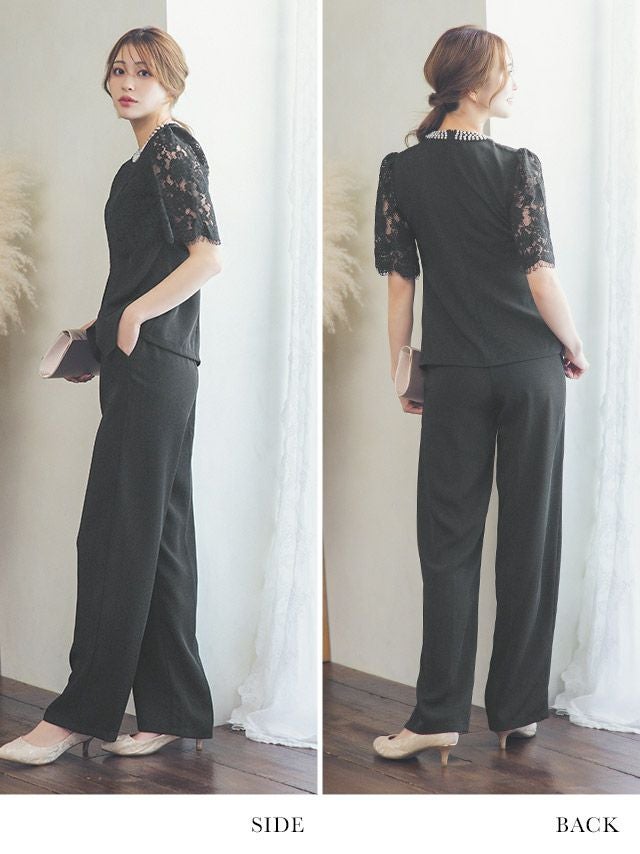 パーティードレス 大きいサイズ パンツ 結婚式 二次会 フォーマル 袖あり 体型カバー 黒 セットアップ myMinette マイミネット パールラウンドネックシアーレースショルダートップスパンツ結婚式パーティードレス