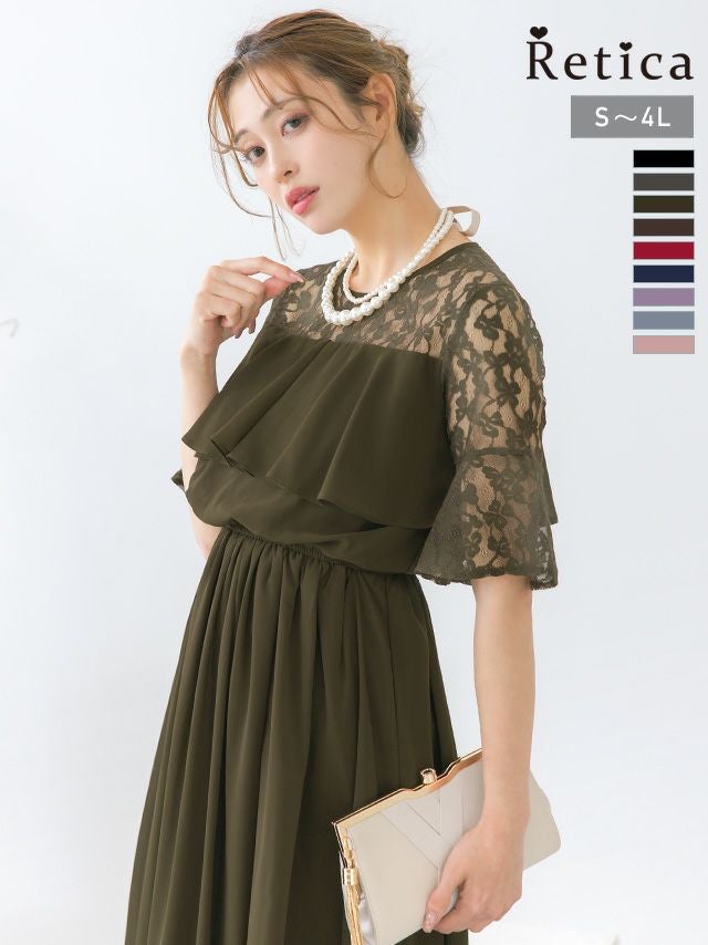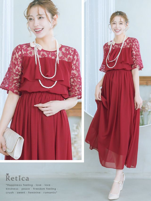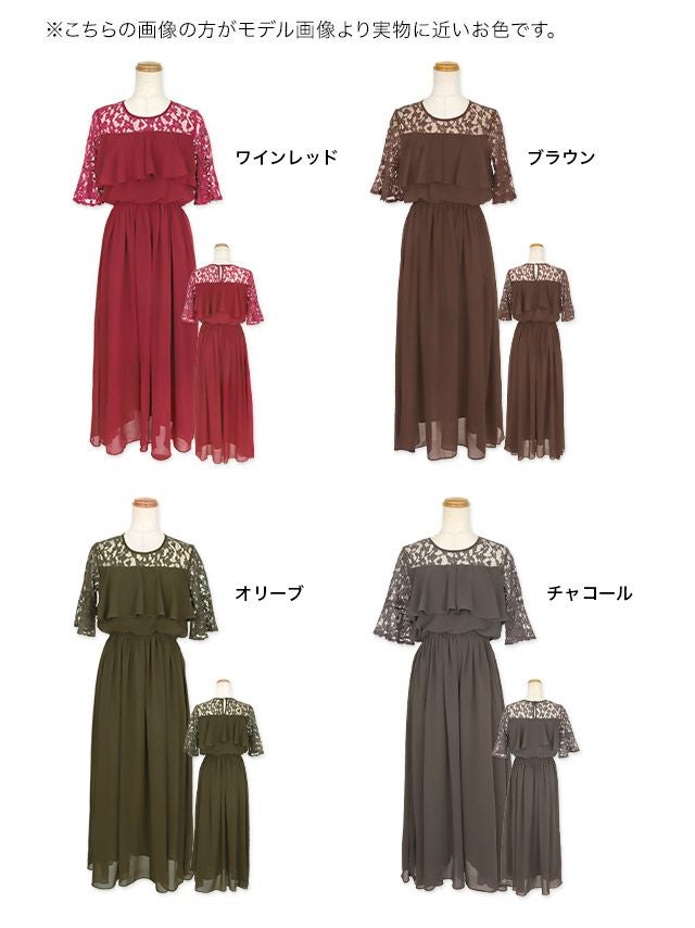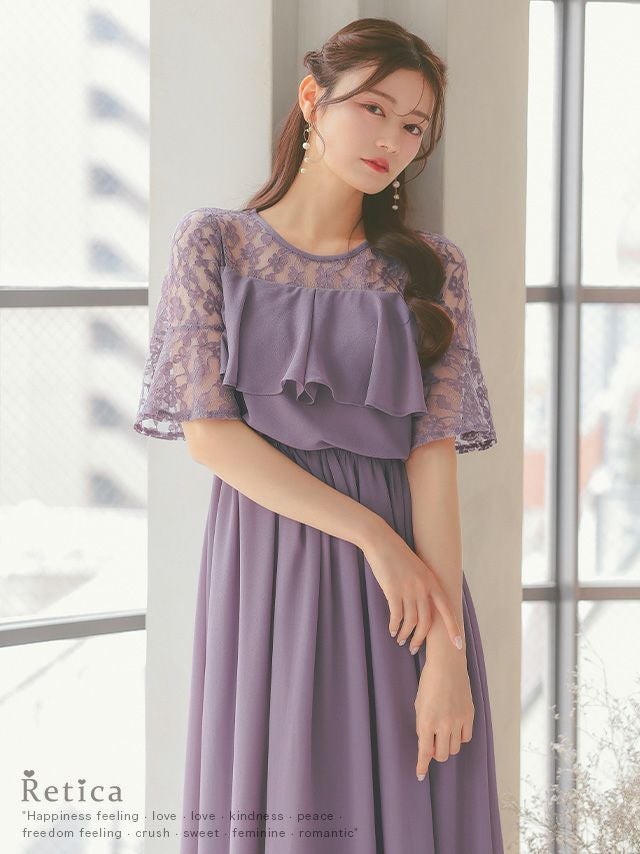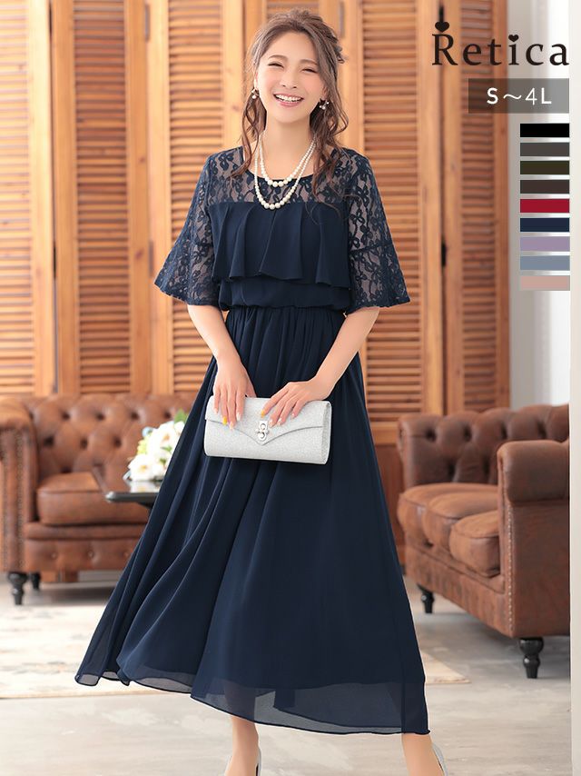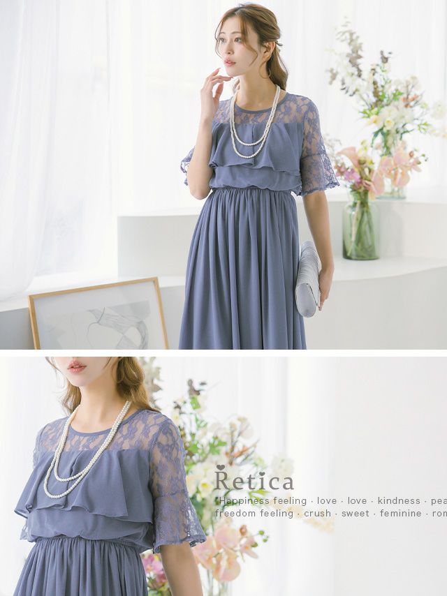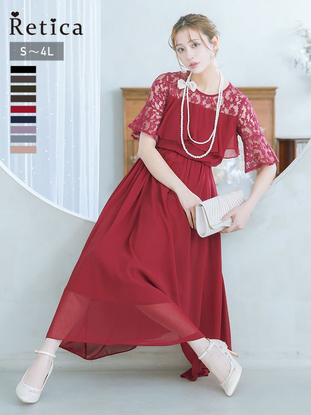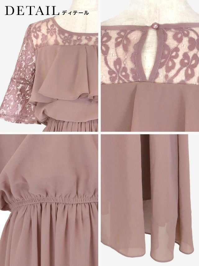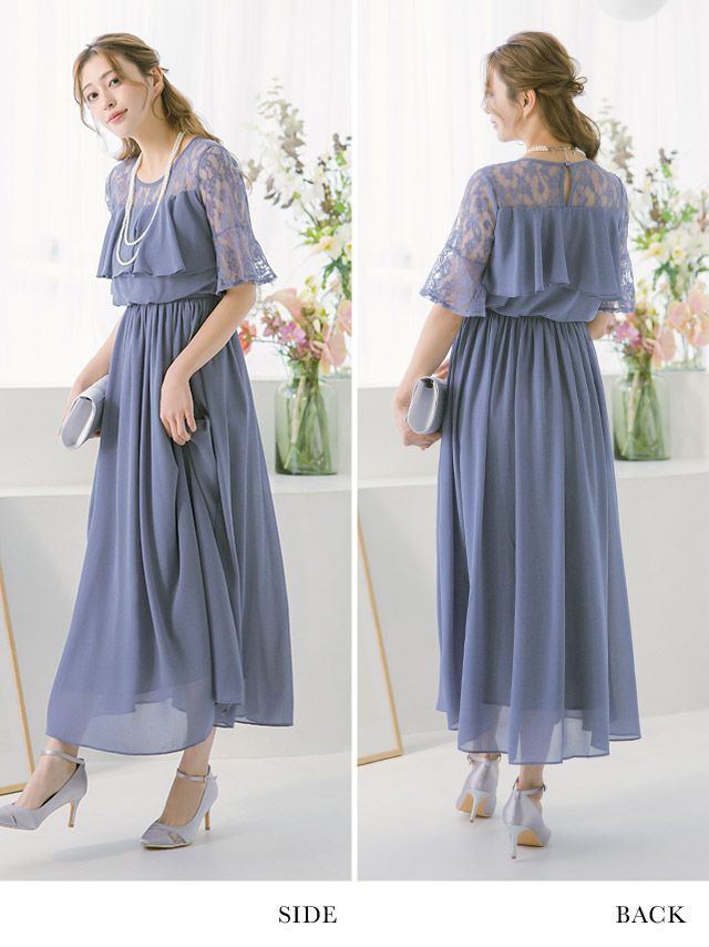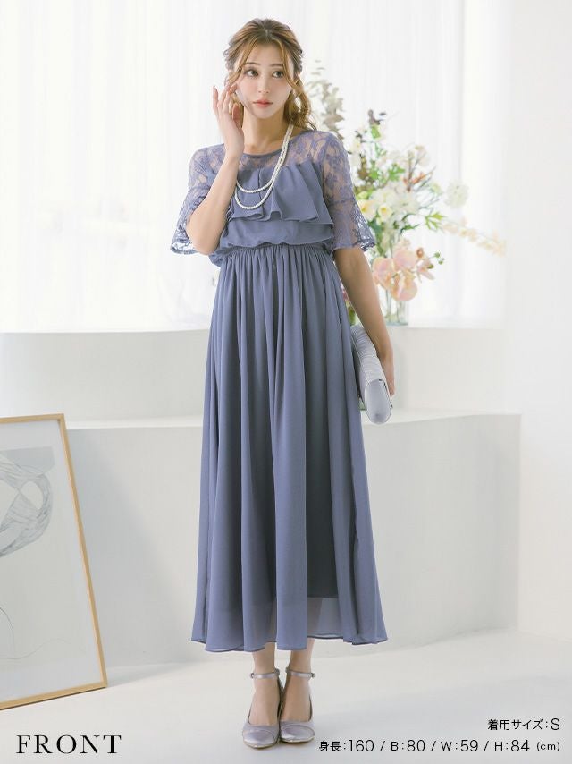 結婚式 パーティー お呼ばれ 二次会 ロング丈 安い 通販 myMinette マイミネット バストフリルシアーレースショルダー五分袖フレアロング結婚式パーティードレス