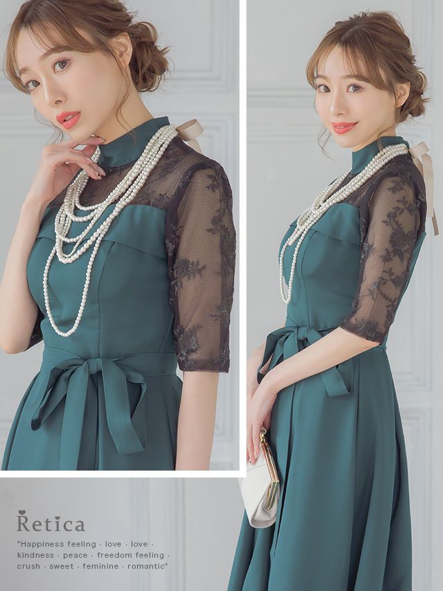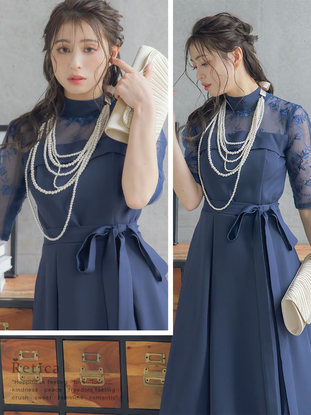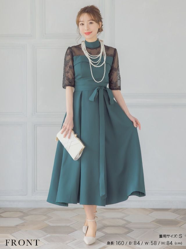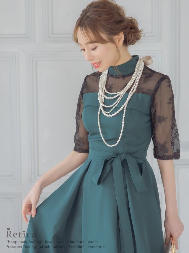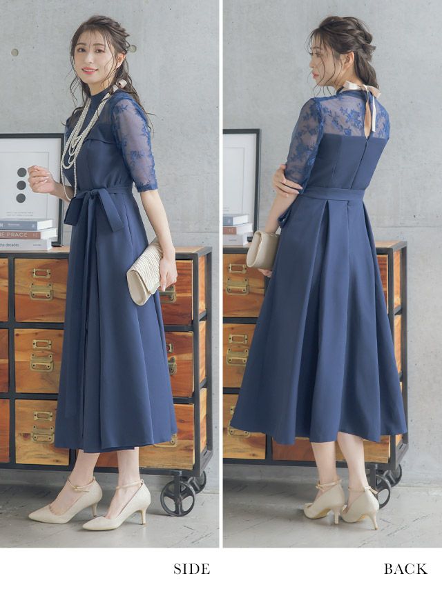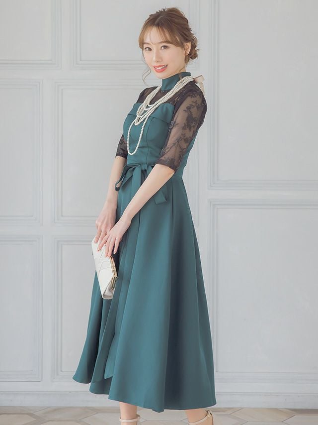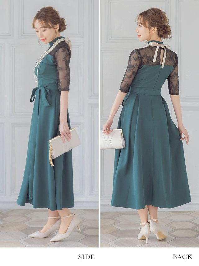 レースショルダーウエストリボンデザインミモレ丈結婚式パーティードレス