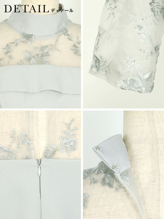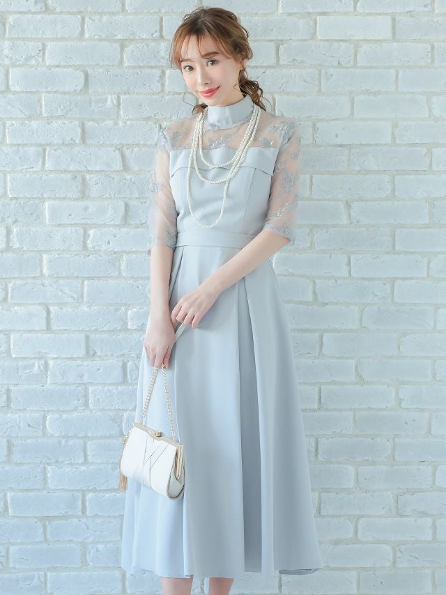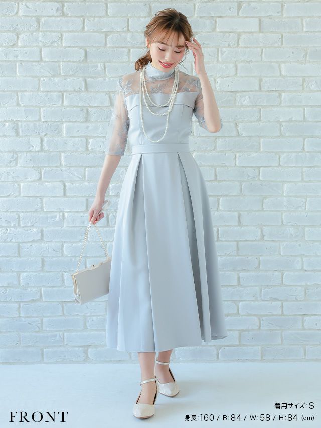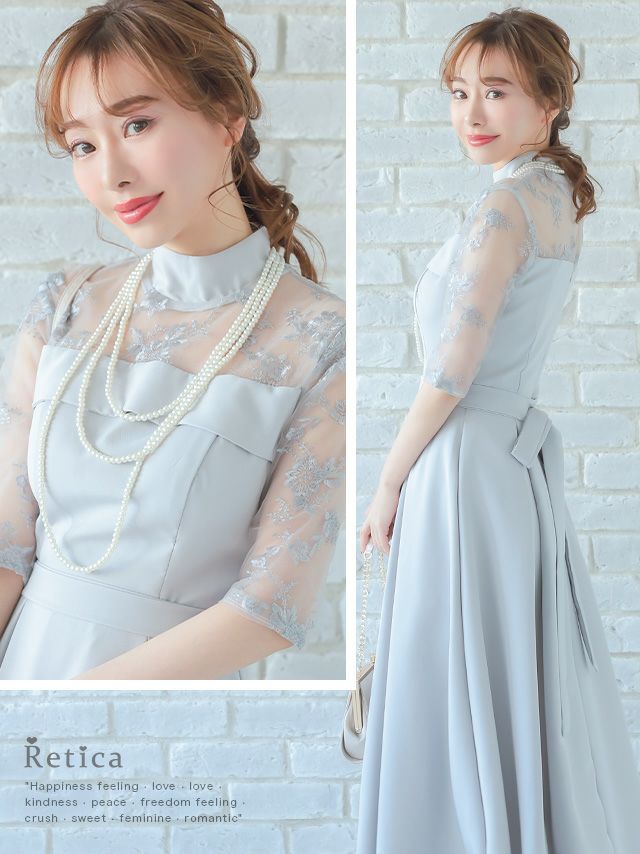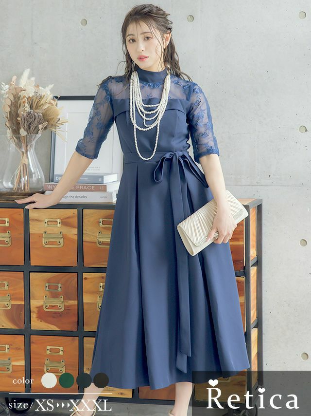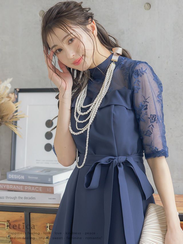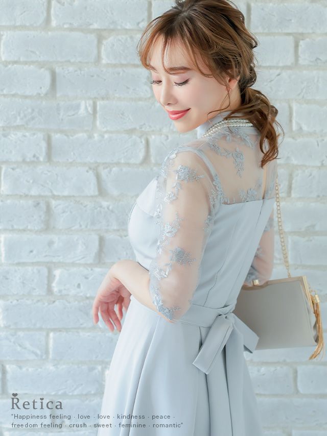レースショルダーウエストリボンデザインミモレ丈結婚式パーティードレス