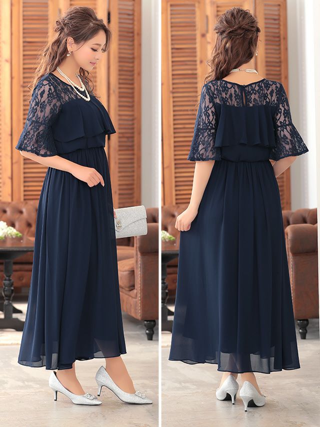 レース五分袖Aラインシフォンフレア大人ロング結婚式パーティードレス