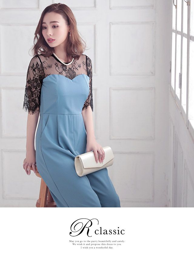 スカラップフラワー肌見せ大人レーススリーブフレア結婚式パーティーパンツドレス