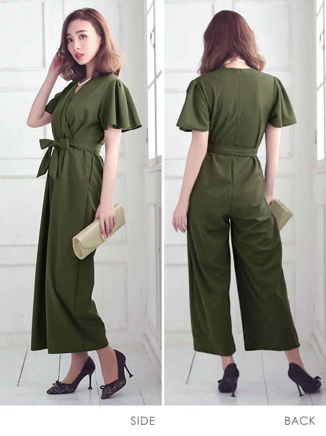 カシュクールネックウエストリボン大人ハンサムスタイルアップ結婚式パーティーパンツドレス