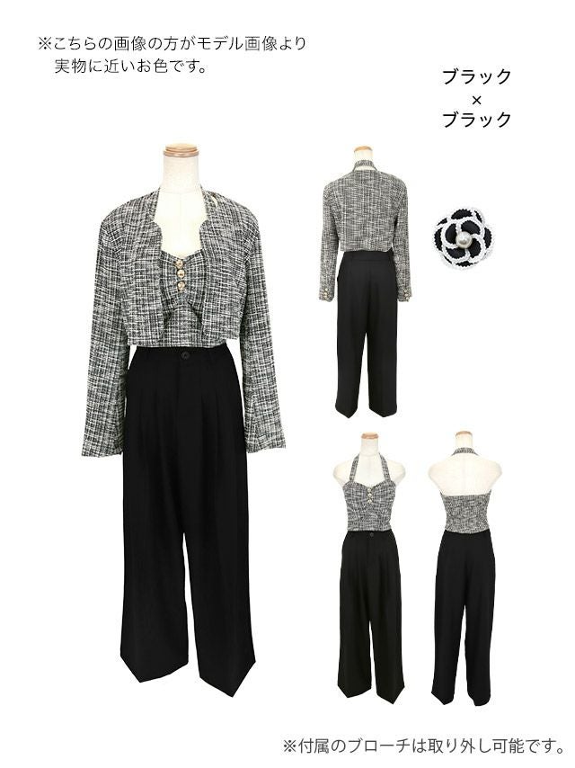 コサージュ付きノーカラーツイードジャケット&ビスチェセレモニーパンツスーツ
