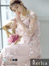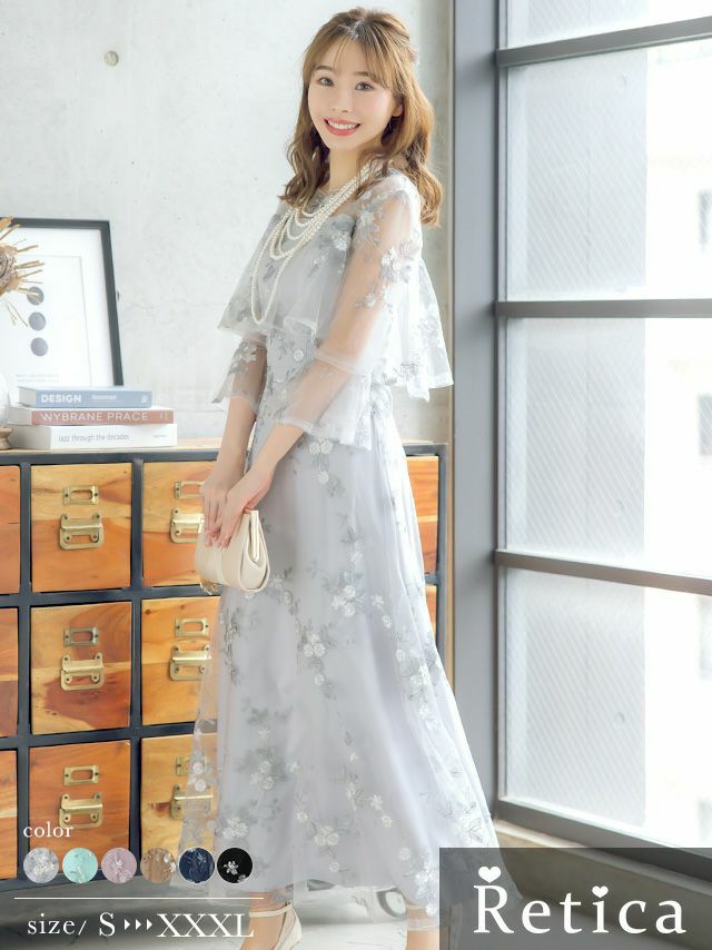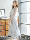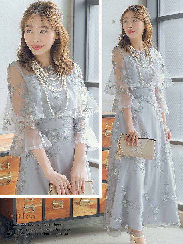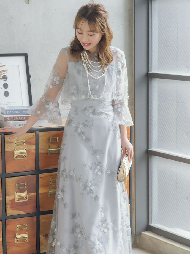 シアー フラワー刺繍 チュール ロングスカート ベルスリーブ 結婚式 パーティー ドレス myMinette マイミネット ショート丈花柄デザインボリュームチュールロング結婚式パーティードレス